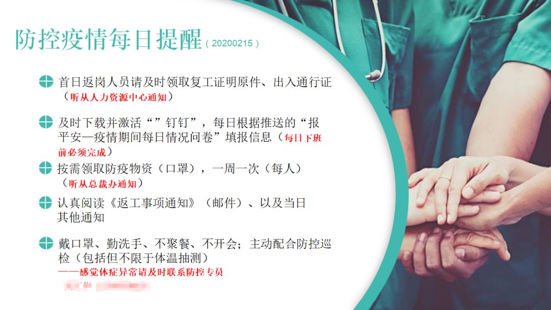 除了符合屬地政府針對復工“六到位”要求,和仁科技進一步細化各項工作,例如:安排疫情防控專員,進行防控物資統一分配登記、日常防控巡檢等,同時還通過公司職場各入口電視大屏,進行“防控疫情每日提醒”等關鍵措施、注意事項提醒等。