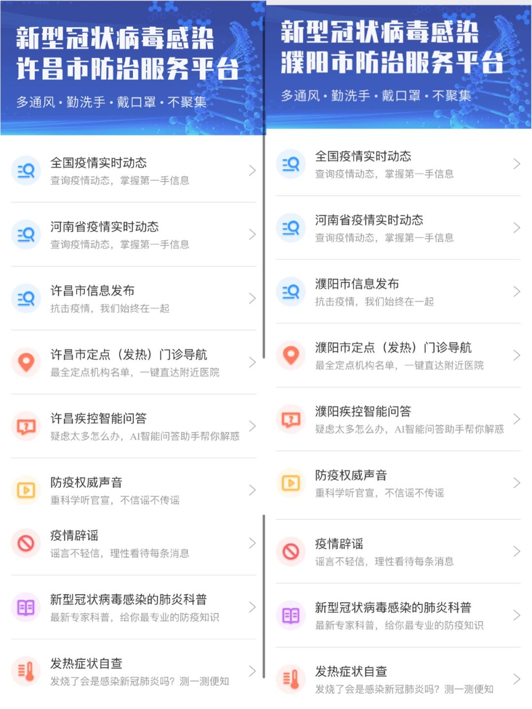 隨著防治服務(wù)平臺的正式上線,濮陽市、許昌市和延津縣居民可以隨時隨地通過手機在查看全國及河南省的疫情實時動態(tài)、地方權(quán)威指令公告及全面防疫指南等信息的同時,通過定點(發(fā)熱)門診導(dǎo)航、智能問答、防疫權(quán)威、疫情辟謠、防疫科普等板塊的設(shè)置,讓居民可以不信謠、不恐慌,正確認(rèn)識疫情,堅定共同戰(zhàn)勝疫情的決心。