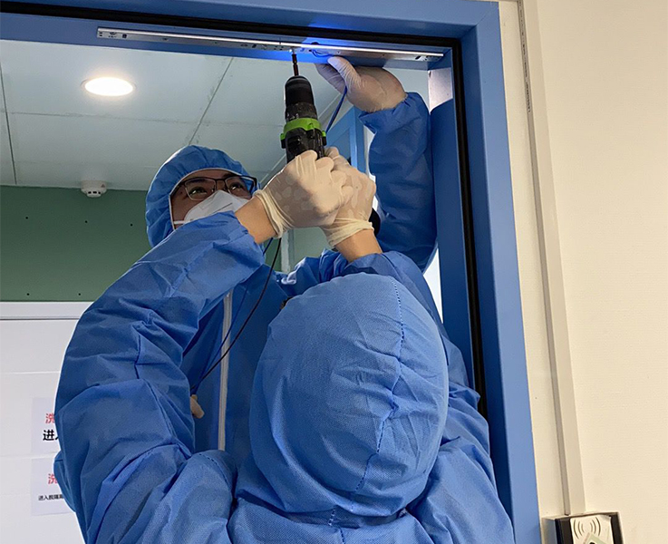 在武漢同濟醫院中法新城院區被指定成為“武漢市新型冠狀病毒感染的肺炎危重病人救治定點醫院”后,為滿足包含傳染病區等在內的20個病區共計1000張床位的管控要求,以及光谷院區的830張床位的改造需求。和仁科技服務團隊立即組織、協調資源,安排施工計劃和施工方案。同時,為保障項目高質量、高標準完成,增派工程師駐場溝通、協調施工方案細節。和仁科技服務團隊克服時間緊、材料缺、施工難度大等問題,歷時兩天完成光谷院區的病房改造工作,六天完成中法新城院區的病房改造工作。